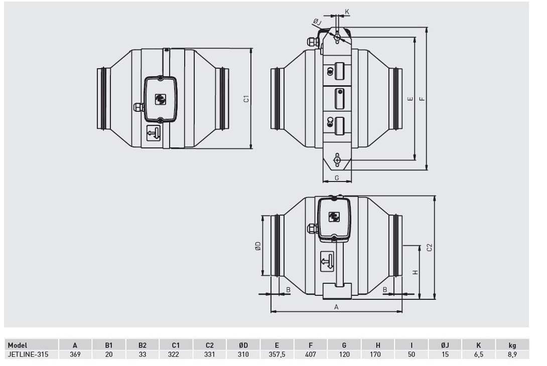 Круглий канальний вентилятор JETLINE має високу продуктивність, низький рівень шуму і компактні розміри. Стандартний модельний ряд із продуктивністю від 260 до 1080 м3/год.