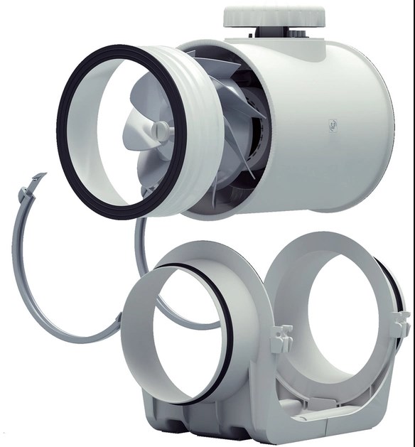 Герметична конструкція з подвійним уприскуванням між основним корпусом і опорним кронштейном для запобігання витоку повітря. Гумові прокладки на фланцях для поліпшення герметичності каналів. Сайлент-блок між двигуном і напрямною лопаткою для зменшення вібрації двигуна та зниження рівня шуму під час установлення навіть у разі регулювання швидкості.