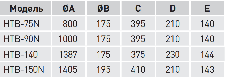 Серія HTB складається з чотирьох моделей, з діаметром крильчатки 80 см, 100 см, 140 см. Електродвигуни оснащені вбудованим термозахистом.